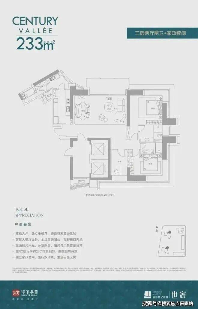 深业世纪山谷主打高端纯改善定位,主力户型涵盖233-386㎡三至四房及云端复式,共1627户,8梯3户配置,双梯入户,圈层纯粹无小户型混杂。户型采用LDKB一体化设计,3.5米奢阔层高,部分户型拥有270°IMAX观景视野,全系精装交付,配备一线品牌家电与智能家居,适配高净值家庭终极改善需求。
