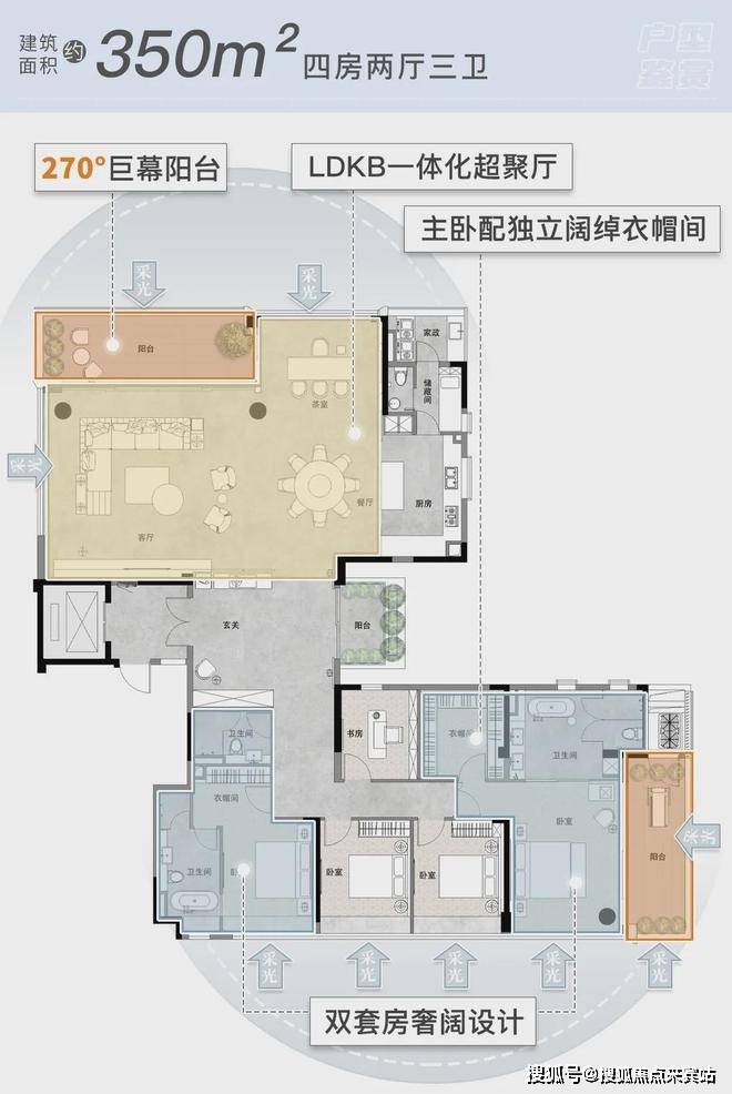 在目前的豪宅市场上,仅有松樾能同时将 LDKB一体化设计、分离式公私区、三阳台、双套间甚至三套间等元素汇聚在同一单元内。