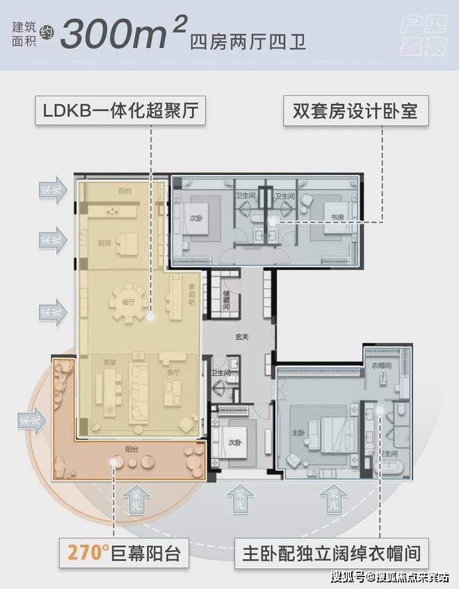 该户型中,LDKG一体化大方厅、四开间朝南、过道极致缩减、主卧个性化等突破,肉眼可见。