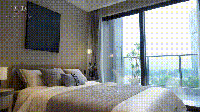 主卧空间尺度奢阔,南北通透,具有超宽开间3.7m,同时设计了全落地YKK系统门窗的凸窗,每日起床均可享有自然阳光。