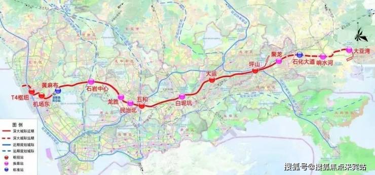深大城际:该线路起自宝安机场T4站,途径宝安区、龙华区、龙岗区,最终至坪山区聚龙站,全线长69.2公里,设计时速160公里,从坪山-机场仅需40分钟,全线地下敷设11个站点,分别是T4枢纽、机场东、黄麻布、石岩中心、龙胜、民治北、五和、白泥坑、大运、坪山、聚龙,另外预留惠州3个站点。