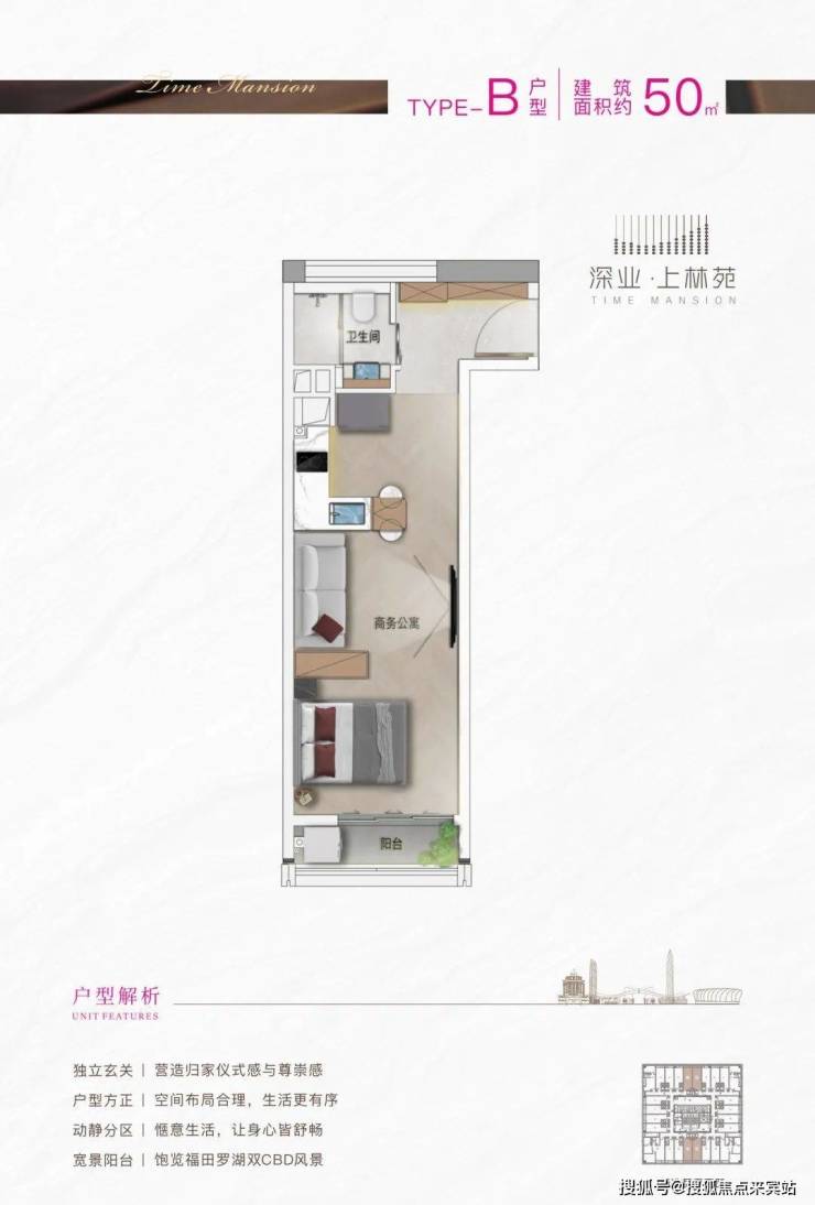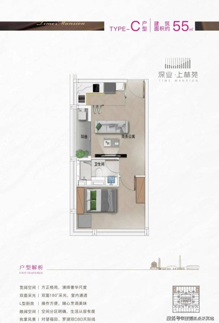 建面约55㎡的户型为一房一厅空间,格局方正。开放式的客餐厨的设计,让小户型避开了空间的拘束。另外,整体空间动静分离,让各个地方都分工明确。『公寓、办公双大堂,电梯均采用国际一线品牌静音高速电梯』