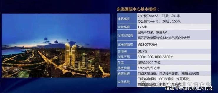 【东海国际中心】占地3.6万平米,总建筑面积50万平米,整个项目由办公楼、酒店、摩天公寓、商业四大部分组成;占据香蜜湖金融中心成熟商圈,是现今深南大道两旁最大的综合建筑群;其中办公楼2幢,高度约为150-190米;酒店1座,约为100米;商务公寓2幢,高度约为300米及255米;以及6.5万平方米的东海滨纷天地商业。