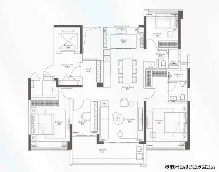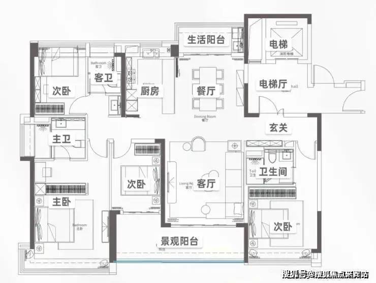 建面约160㎡四房两厅三卫,奢享全广扛鼎四房,奢享约10㎡专属电梯厅,玄关入户,保护私密性,从客厅贯穿次卧,约4米大开间,LDK餐厨一体化,南北双向阳台,约6.4米超宽阳台,南向卧室直通阳台,舒适采光豪华景观。