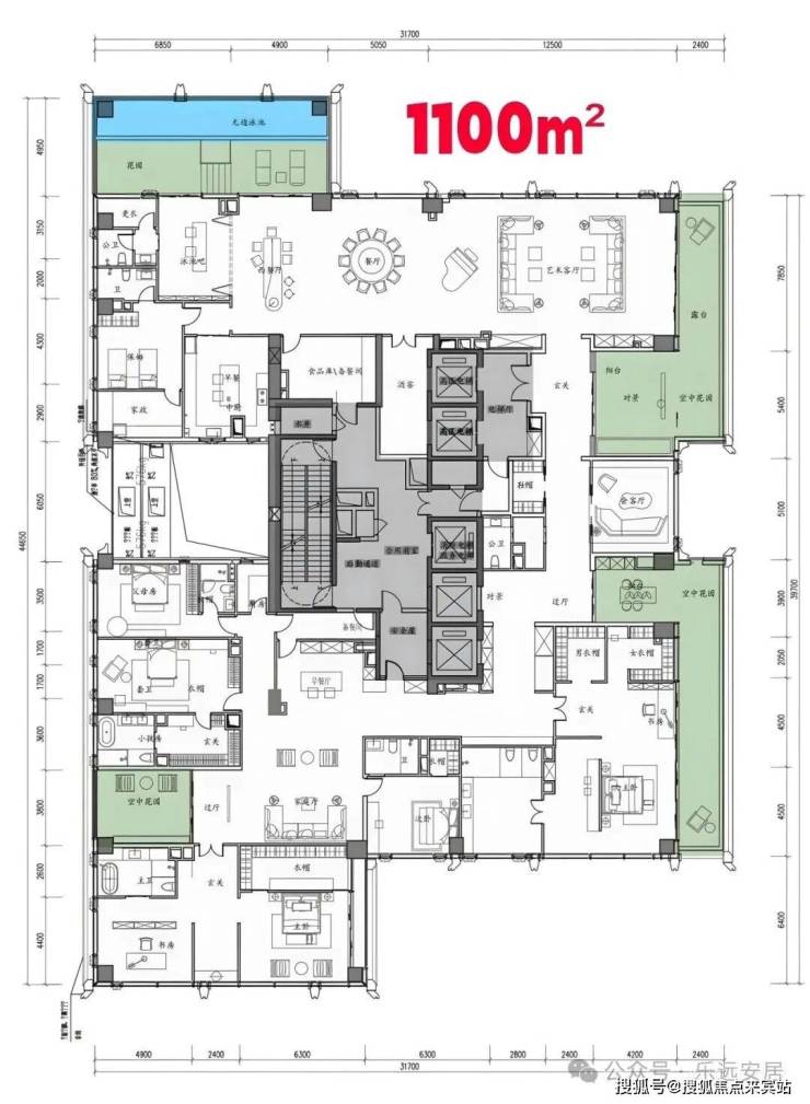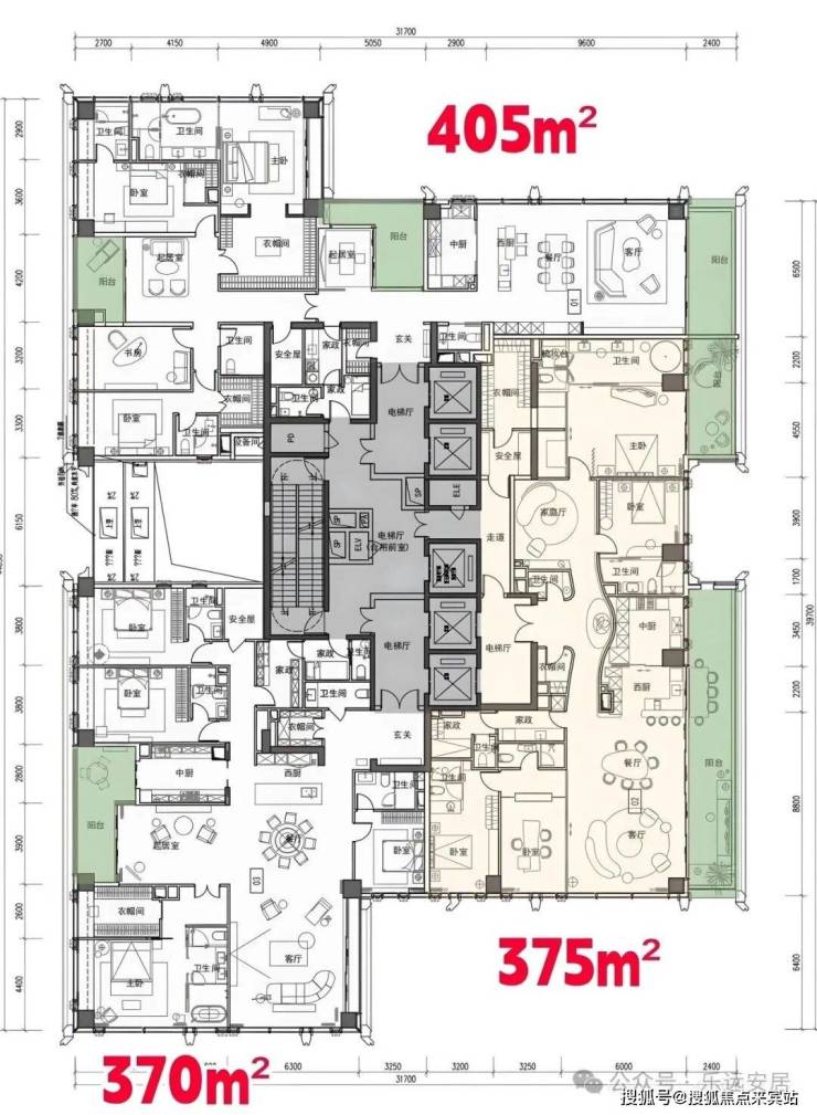 500㎡大平层, 客厅约10米进深、开间12.5米,阳台开间约12.5米,5房(4套房)700㎡大平层,客厅约13.5米进深、开间约11米。阳台开间约15.5米,5房(4套房)