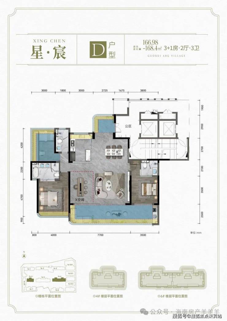 D户型: 建面约166.98-168.4㎡ 3+1房2厅3卫