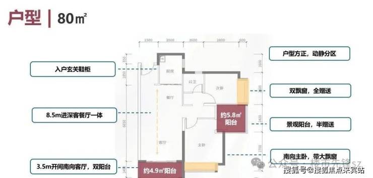 建面约80㎡的户型开间就有约3.5米,格局方正、动静分离、空间开阔、采光充足。基本上达到了市面上90㎡以上户型的尺度。