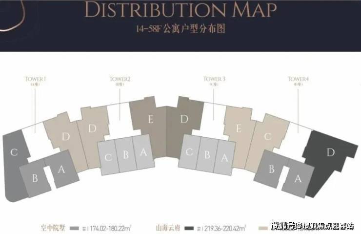 云端居所:14-58层为天际海景公寓,主力户型建面123-220㎡,包含复式院墅与平层大宅,最高使用率突破180%(如130㎡平层实得232㎡);