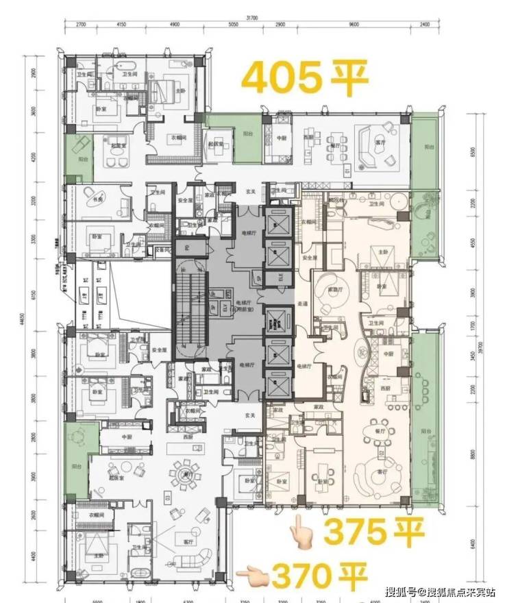 2️⃣700平客厅约13.5米进深、开间约11米。阳台开间约15.5米,5房(4套房)