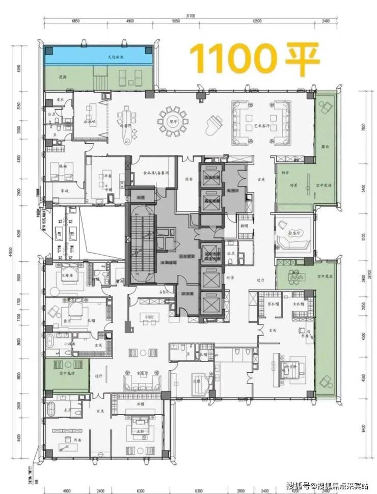 1️⃣500平 客厅约10米进深、开间12.5米,阳台开间约12.5米,5房(4套房)