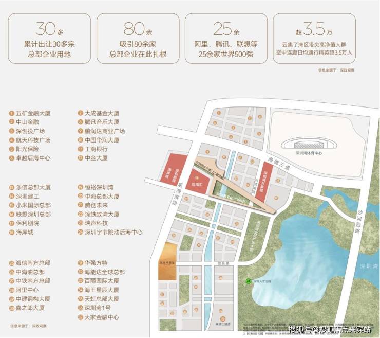 后海总部基地,地处粤港澳大湾区几何中心,是链接深圳各核心功能区的关键节点,是大湾区资源密度最高、制度最开放的总部经济聚集地,创富密度全国榜首,世界500强领袖级总部集群。