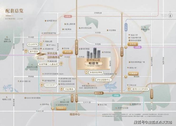 项目隶属深圳都市核心区民治板块,毗邻北站国际商务区(深圳六大总部基地之一),定位为“大湾区核心引擎”与“国际会客厅”。未来片区将升级为“华南数字超级总部基地”,并依托梅观创新产业走廊(20公里产业带)形成高能级产业集群。
