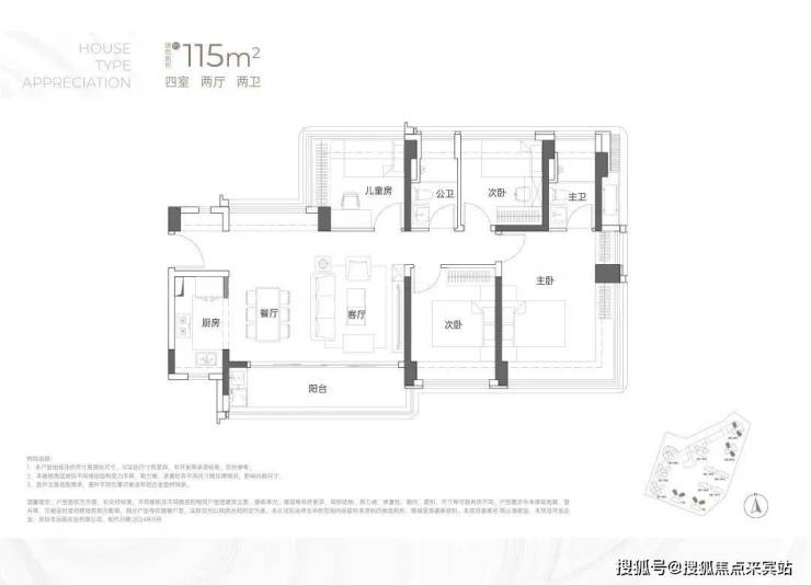 竖庭格局,西南向,基本居住功能与建面约108-110㎡4房2卫一致,但格局不一样,从目前公布的户型图上看,主要是主卧空间有了更大的提升,比如可以放更大一点的衣柜。但从位置上看,它所在的楼栋更靠近主干道,会有噪音影响。建面约115㎡4房2卫