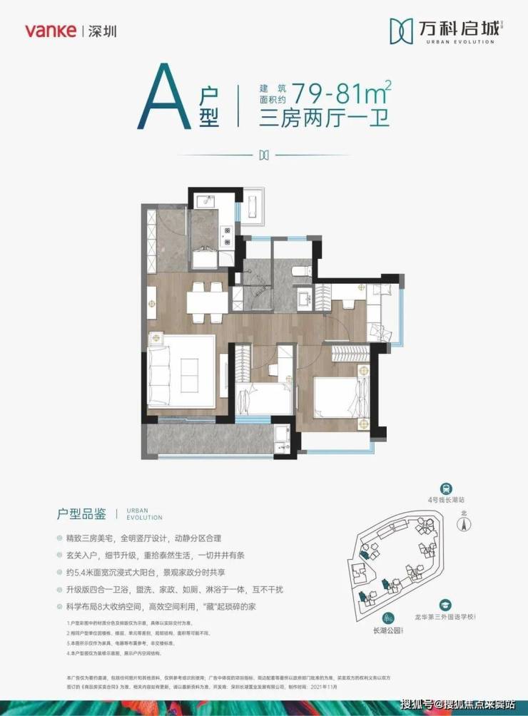 位于龙华区观澜大道与碧澜路交汇处西北侧,总占地面积约 6.5 万㎡,总建筑面积约 52.8 万㎡,容积率为 5.07-6.14,绿化率 35%,规划户数 1402 套,物业费 5.08 元 /㎡/ 月。项目于 2024 年 12 月交付,为现房项目。现在加推5栋楼王主推 79-115㎡三至四房精装住宅,共有四种主力户型。其中,79-81㎡为三房两厅一卫,采用经典竖厅设计,三开间朝南;96㎡为三房两厅两卫,是 5 栋楼王专属户型,有宽景横厅;99-102㎡为三房两厅两卫,南北通透,客餐厅一体化;112-115㎡为四房两厅两卫,LDK 一体化横厅设计,可纵览社区中庭景观。