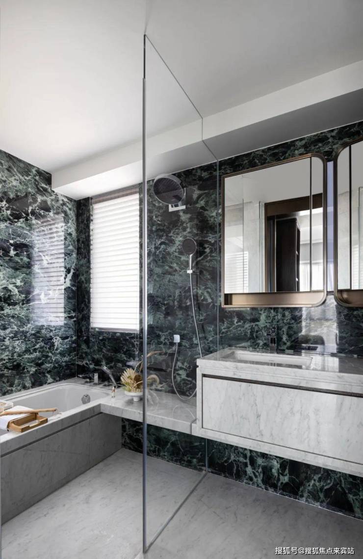 而主卫,普拉达绿大理石的墙身,与意大利卡拉拉白石材呼应,则带来宛若陷入森林的感觉,颇有灵动、优雅的意韵。