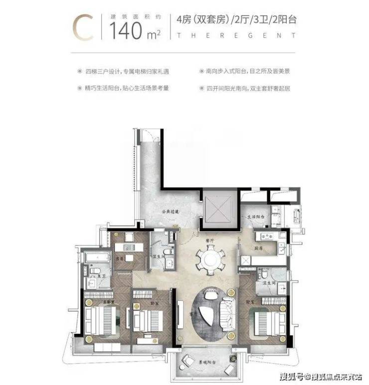 其四梯三户设计,户户享有专梯入户的礼遇,电梯门一打开,就是你的私属世界。