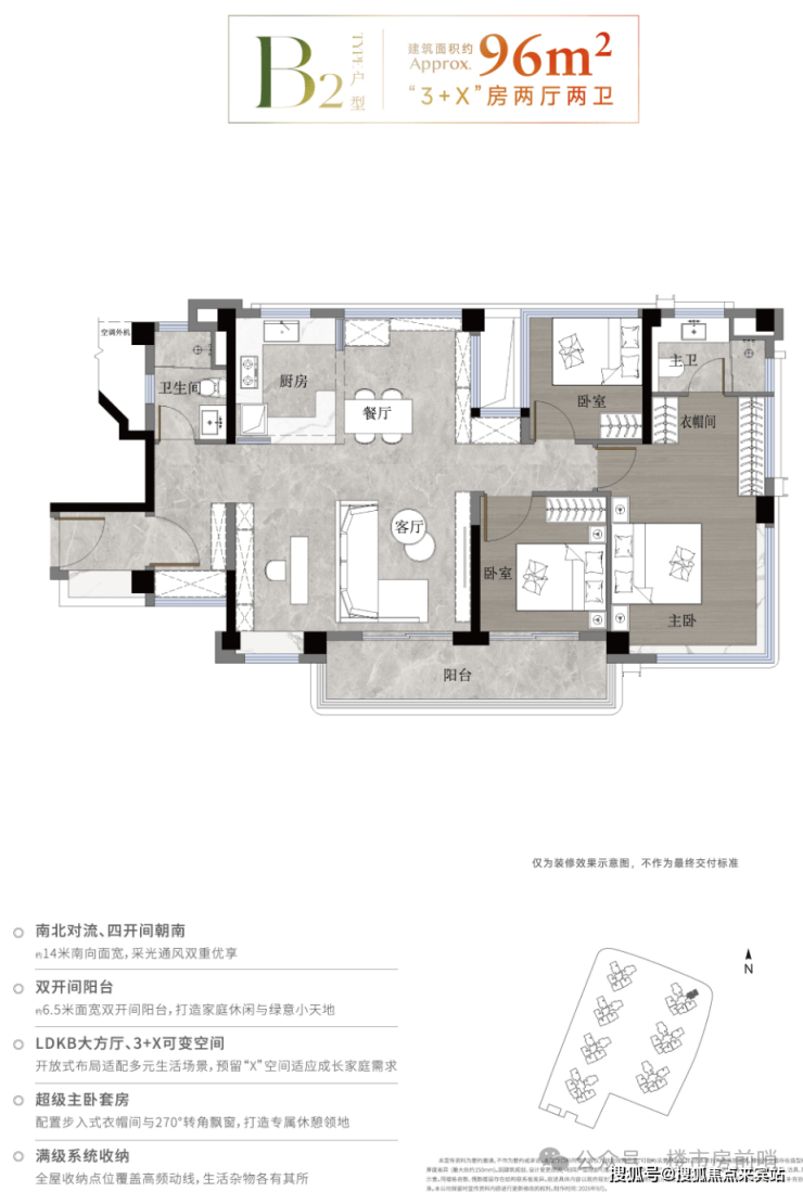 96平3+1房2卫,一个东南向南北对流版本,一个传统竖厅版本,前者更出彩。