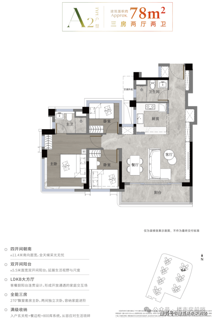 78平,客厅开间5.8米,这还是在3房的前提下。