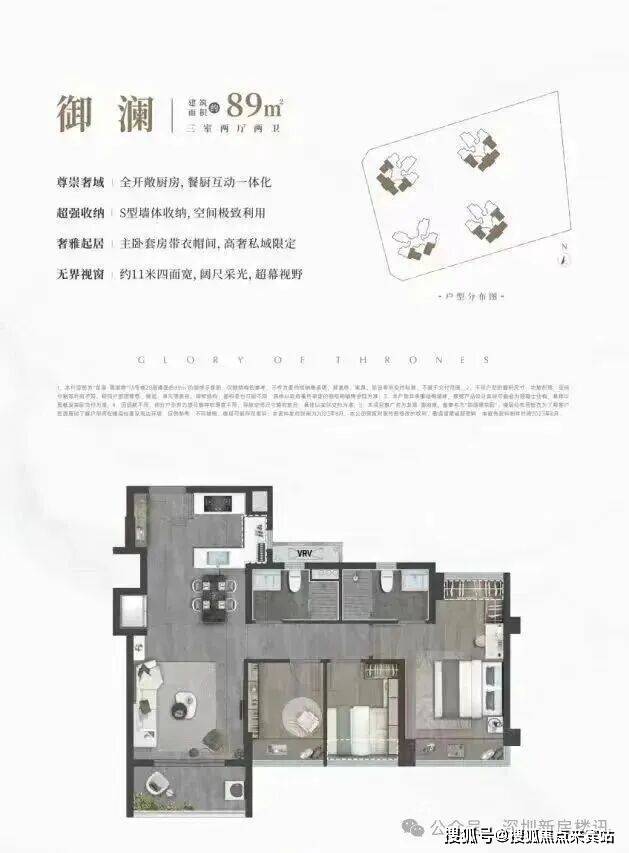 设计的是横厅南北通透格局,客餐厅开间8米,约14.7米超幕视野,超长阳台,主卧转角270°大飘窗,U型厨房,得房率:78.99%(不含赠送),阳台主朝西南或东南向。