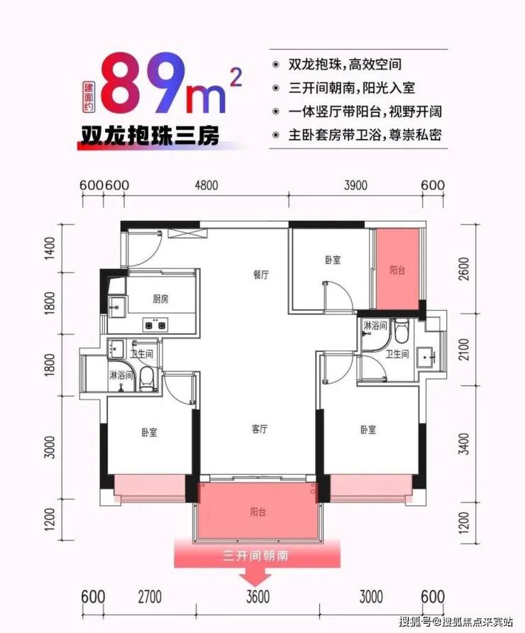 2、户型:建筑面积约89㎡三房两厅两卫,东南朝向,双阳台,主卧套房设计