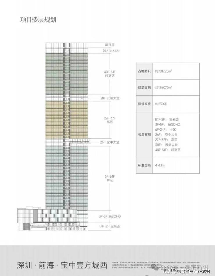 华侨城宝辰总高230米,为宝中最高楼;项目52层,分为中区、高区、超高区,6层起卖,11、39F为避难层,25-26F为空中会所,28F为空中大堂。除了空中大堂项目还有地下入库大堂+首层大堂,一共三重大堂。