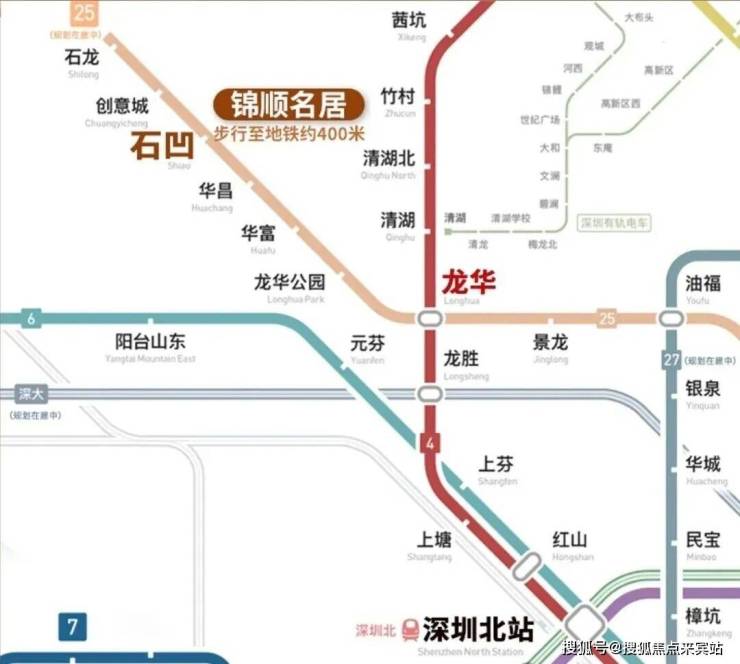 约400m地铁25号线石凹站(在建中,预计2028年运营通车),4站龙华中心/5站深大城际龙胜站/7站红山/8站深圳北站;临近6号线阳台山东站,4站深圳北,5站福田。
