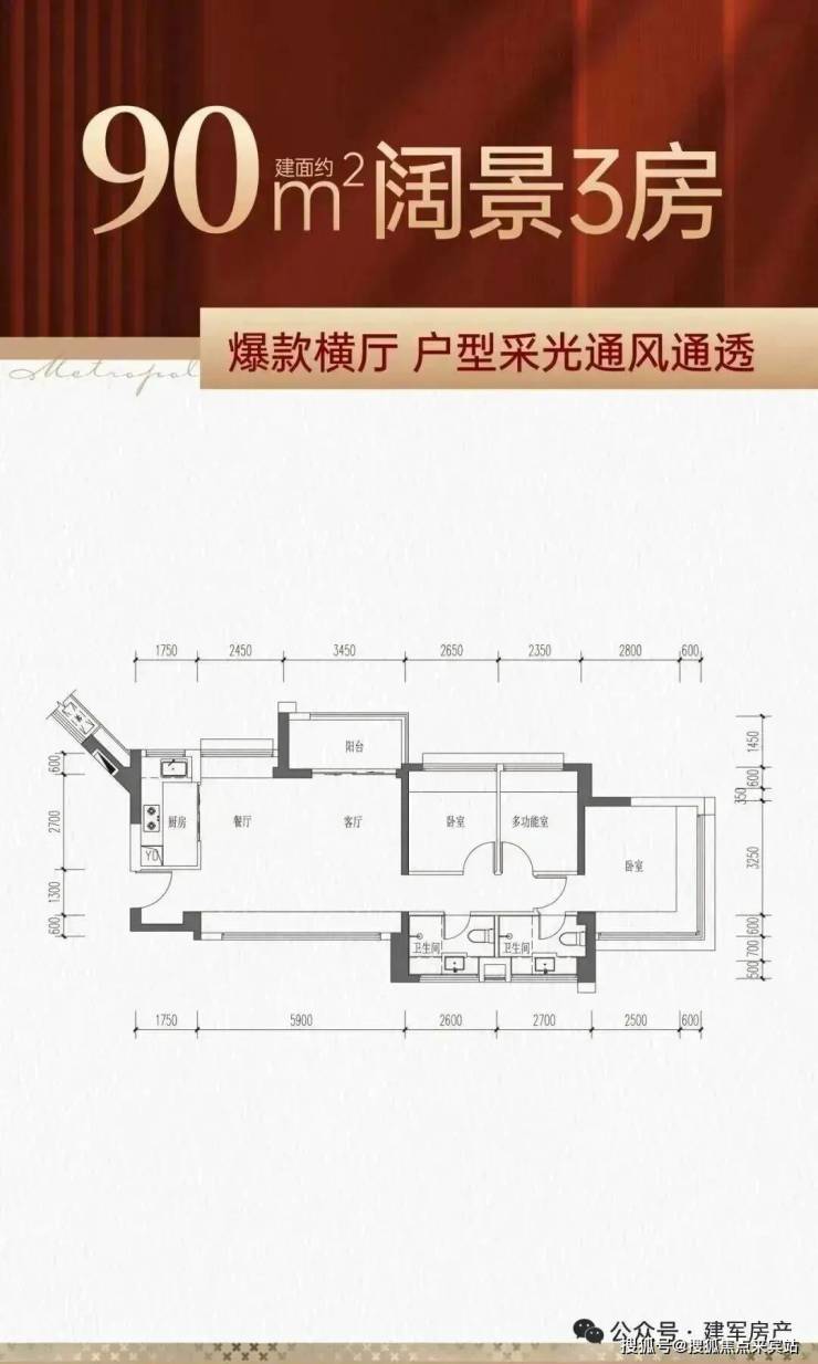 90㎡三房两厅两卫,折后总价约415-439万,折后单价约4.6-4.87万/㎡