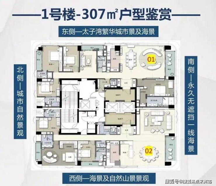307平方米4+1房:四房三卫格局,三阳台设计,亲海阳台总面宽超12米。人性化五房设计,舒适的空间布局,家庭灵动空间可做独立影视厅使用。约50平南向海景套房,尽揽一线海景。