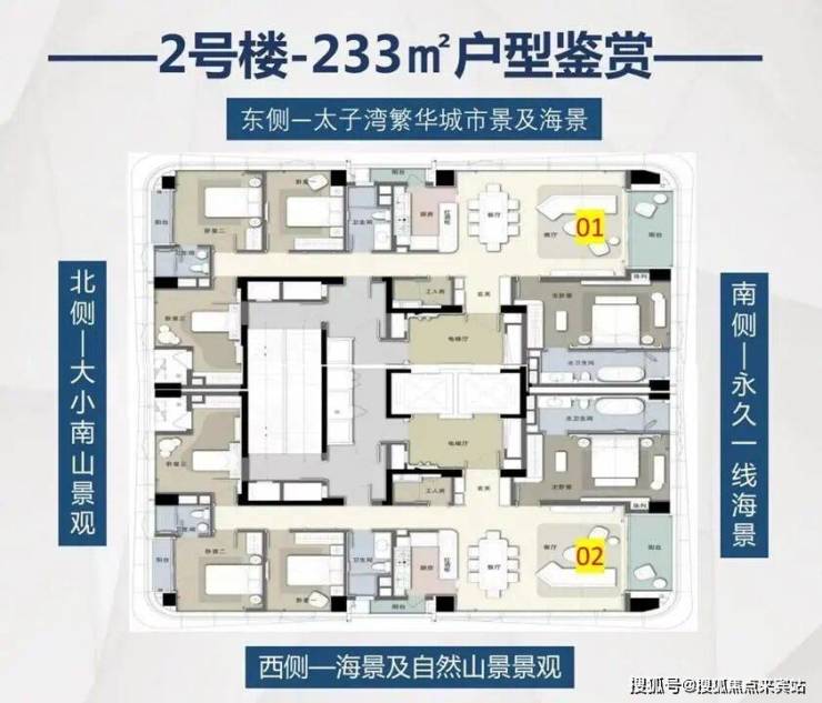 233平方米4+1房:三房两厅三卫设计,2梯2户。超13米大面宽客餐连厅,奢享极致景观面。三阳台设计,近9米海景阳台面宽,3.6米阔绰层高,高挑空间和绝佳景观相契合。