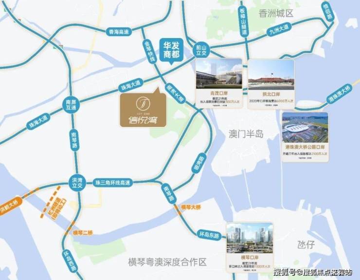港珠澳三城橋頭堡位置,四口岸環繞,5分鐘直達拱北、青茂雙口岸,10分鐘直達人工島、灣仔雙口岸,30min實現港珠澳同城生活圈。
