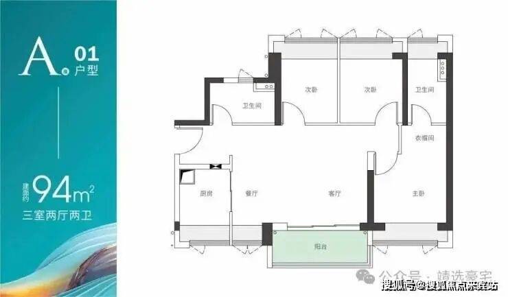 A座01户型-建面约94m² 三房两厅两卫