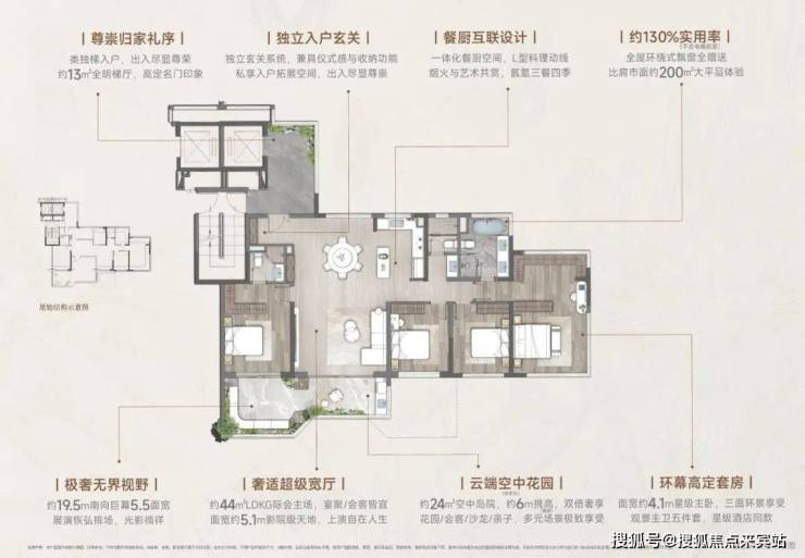 约169㎡户型布局四房两厅四卫,三套房设计、约62㎡别墅级横厅、五星级酒店式主卧、270°城市之窗,极致奢华!