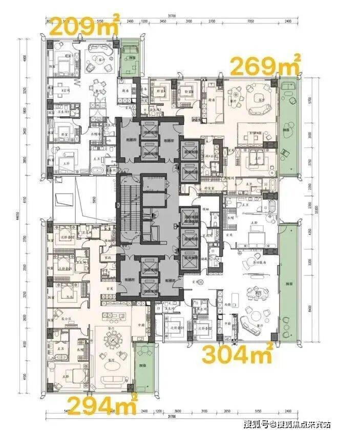 500㎡大平层,客厅约10米进深、开间12.5米,阳台开间约12.5米,5房(4套房)