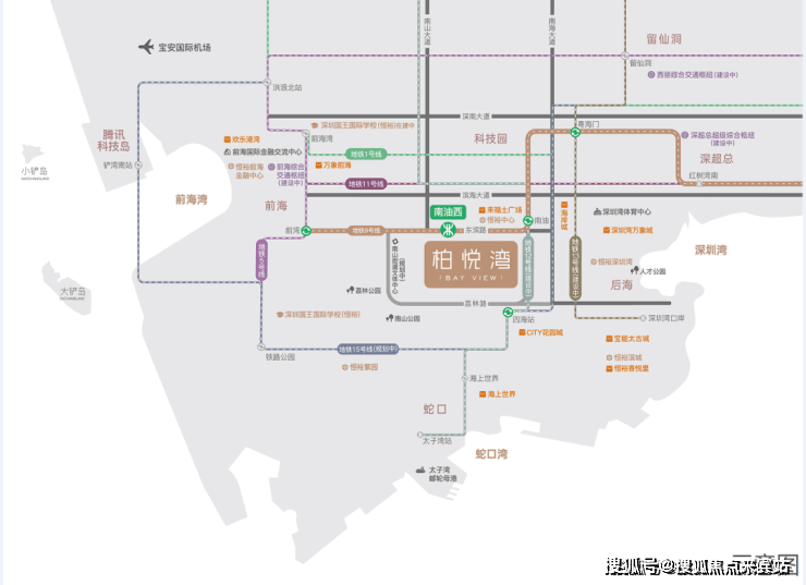 【南油西站地铁上盖——六维立体交通】·轨道交通:地铁9号线南油西站上盖,1/2/5/11/12号线南山站,13/15号线(建设中)四海站环伺。