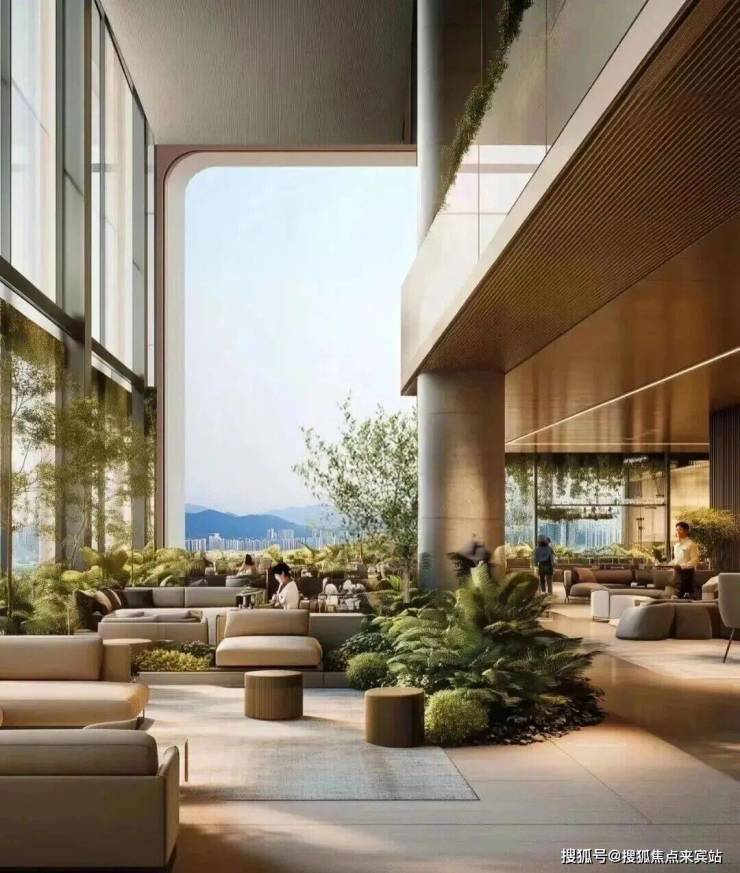 自然融合:效果图显示阳台设计明显,绿植覆盖丰富,强调自然与居住空间的融合,部分超高层观景面采用落地玻璃,无需阳台即可观赏海景。