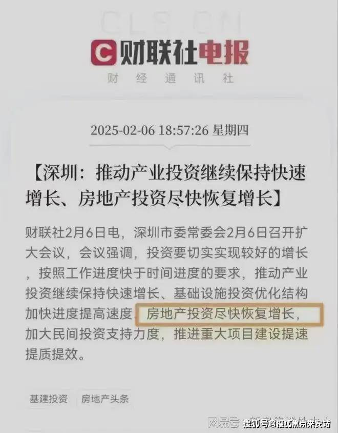 财联社2月6日电,深圳市2月6日召开扩大会议,会议强调,投资要切实实现较好的增长,按照工作进度快于时间进度的要求,推动产业投资继续保持快速增长、基础设施投资优化结构加快进度提高速度、房地产投资尽快恢复增长,加大民间投资支持力度,推进重大项目建设提速提质提效。