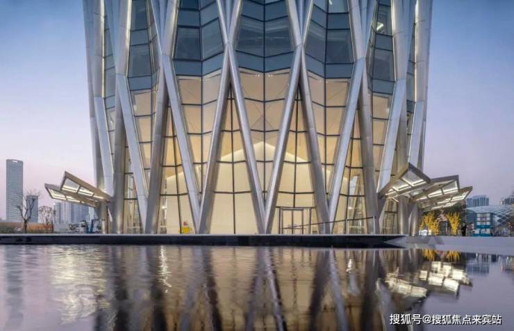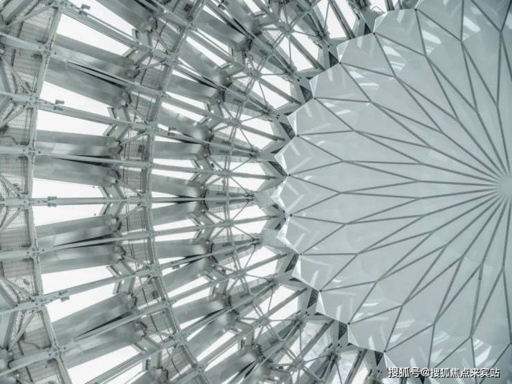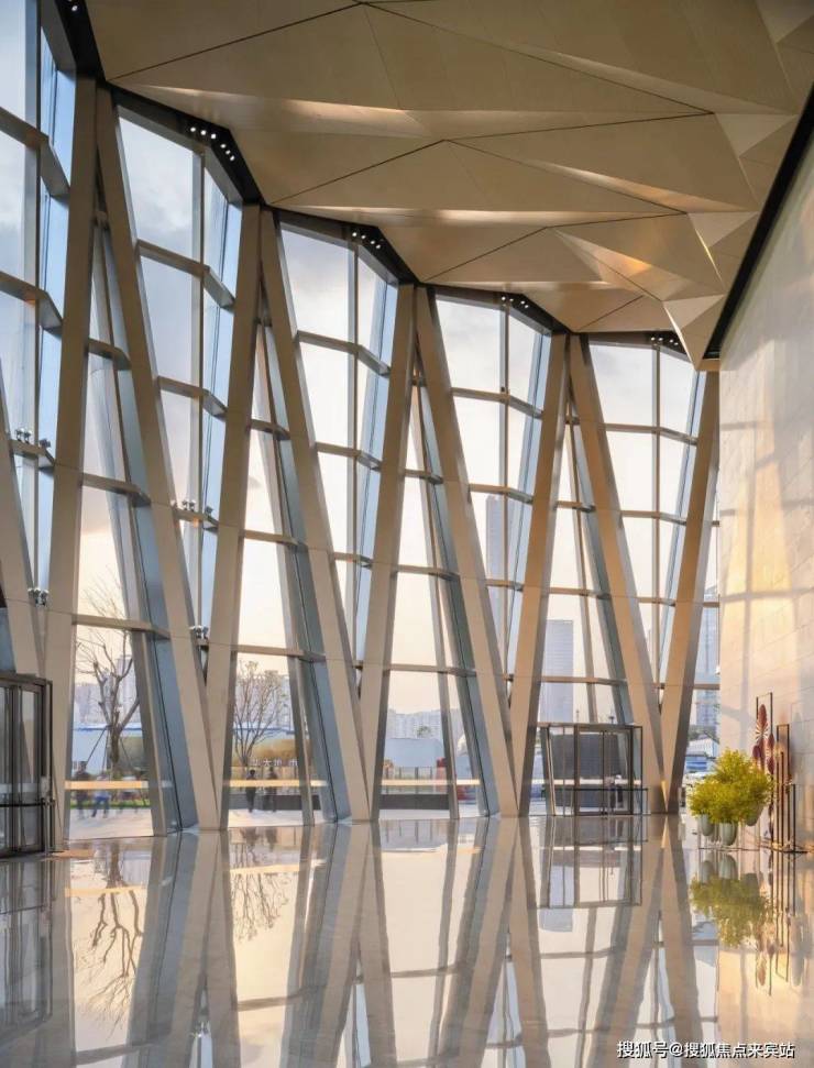 在结构概念上,“管中管”的结构框架成为富有整体感的设计逻辑。钢结构密柱框架和混凝土核心筒的结构系统承担了主要的重力、抗震和风荷载,塔楼幕墙的结构设计优雅有序,并且也提供了部分的受力支撑,帮助塔楼实现了简约轻盈的形态美学。标准层56处纤细的外框结构柱设于平面外沿,以流畅的弧线结合幕墙于顶部汇聚形成水晶型顶盖,不仅创造出无柱的室内空间,还提高了平面使用效率和室内布置的灵活性。 局部搭建的越层旋转楼梯实现高效而富有趣味的内部连接空间,满足企业多元化的办公和事件需求。