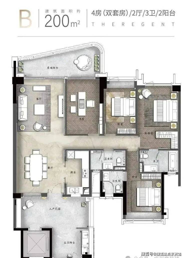 建面约200㎡:4房(双套房)2厅3卫2阳台私属电梯入户