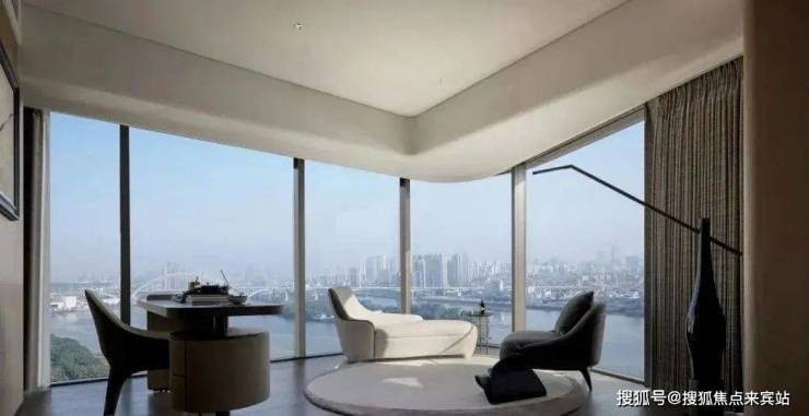 临江面采用大面积落地玻璃窗,环幕江景,270°立面转角全景落地窗,犹如海上行宫床头舱,江景视觉比客厅更佳。据闻,为了保持玻璃和石材的弧度,营造零瑕疵的天幕视野,不惜成本造价,耗费足足4个月的时间才完成安装。