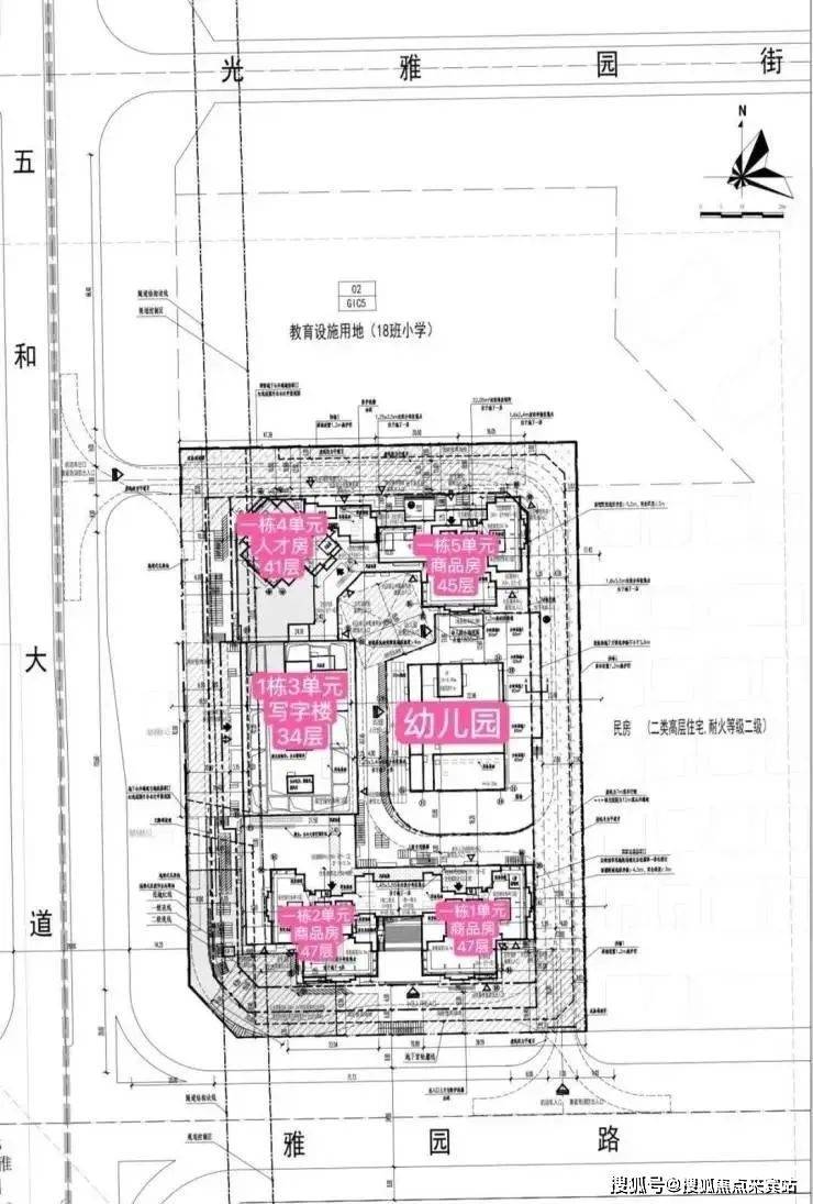 天璞世纪雅园小区2栋楼共分为4个单元,其中商品房3个单元,人才房1个单元41层,还有1栋办公楼、1所幼儿园。小区北边规划有18班小学一所。