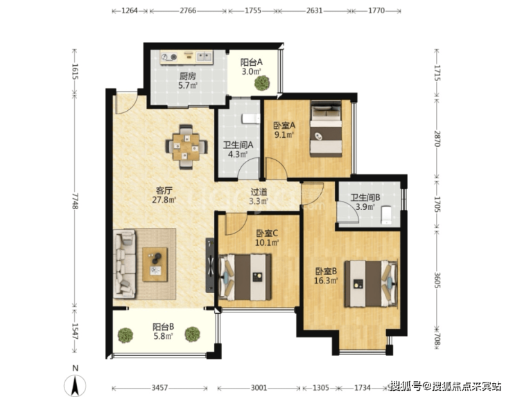 108㎡三房户型每个卧室都比较宽敞,主卧达16㎡,次卧也分别达9㎡和10㎡;客厅开间3.4米。南北两个阳台,部分房源的北阳台和次卧还能看江景。