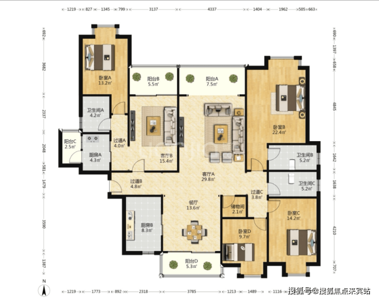 162㎡户型有五个卧室,适合大家庭居住,也是头排江景,客厅开间4米,主卧面积达21㎡,再多的衣服包包都放得下。