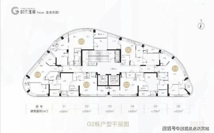 时代珑星共两栋楼,分别是G1栋和G2栋。从外形上看,G1栋算正常,蝶形设计,两梯六户,户型为99-106平三房;G2栋外观略显独特,G2栋推出的面积段为62-79㎡精奢小户住宅。