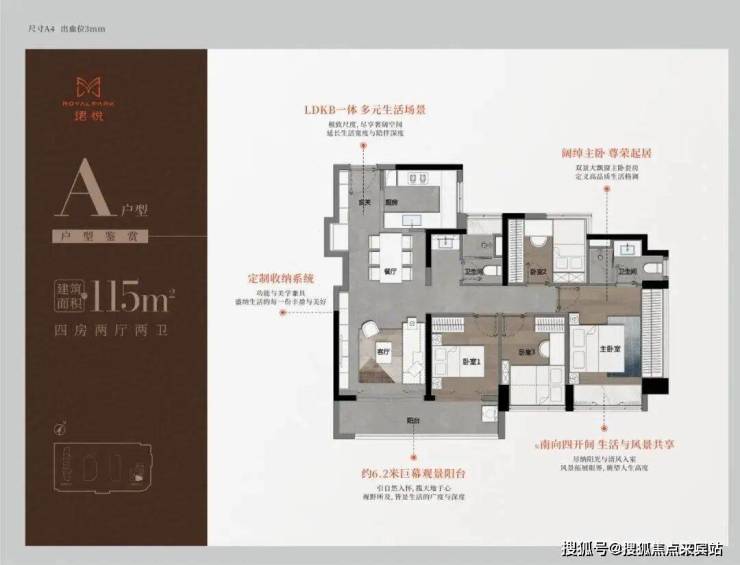 115㎡的4房2厅2卫,A户型(1栋1单元05户型),设计的是经典竖厅格局,进门入户玄关,LDKB一体化,S墙设计预留冰箱卡槽位,四开间朝南,动静分区,主卧双面飘窗,客厅连接次卧出6.2米长的巨幕大阳台,U型厨房,公卫三段式分离,得房率76.77%(不含赠送),套内面积88.71㎡,东南朝向,靓点是2个最小的次卧都不用睡飘窗。