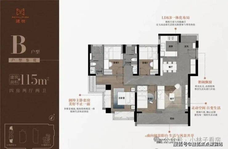 115㎡的4房2厅2卫,B户型(2栋1单元01/06户型),设计的是竖厅格局,进门入户玄关,LDKB一体化布局,三开间朝南,动静分区,客厅连接次卧出阔景大阳台,U型厨房,公卫三段式分离,西南朝向,靓点是端头位可以做到南北通透。