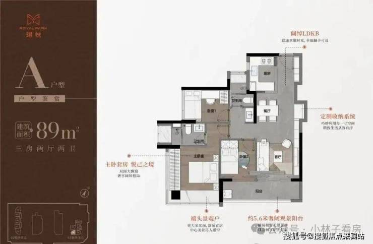 89㎡的3房2厅2卫,A户型(1栋1单元06户型),设计的是经典竖厅格局,进门入户玄关,LDKB一体化,S墙设计预留冰箱卡槽位,三开间朝南,动静分区,主卧双面大飘窗,客厅连接次卧出5.6米长的观景阳台,U型厨房,公卫三段式分离,得房率76.78%(不含赠送),套内面积69.1㎡,东南朝向。