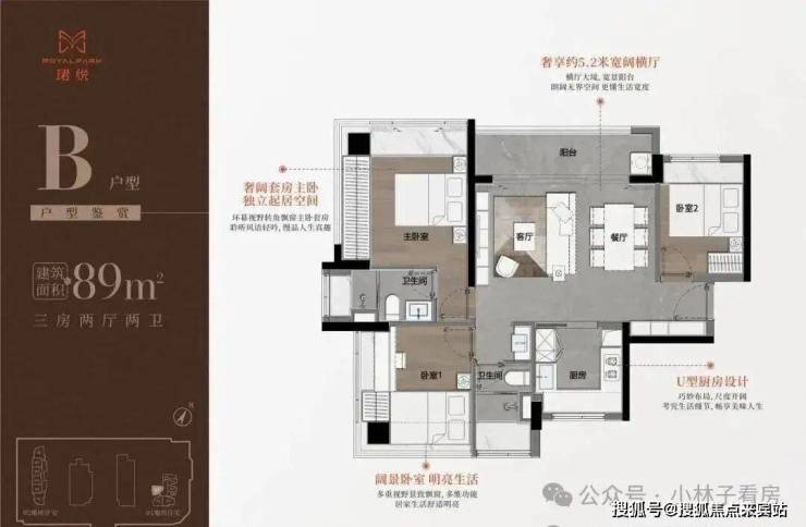 89㎡的3房2厅2卫,B户型(1栋1单元07户型),设计的是横厅南北通透格局,进门入户玄关,客餐厅5.2米开间,LDKB一体化,S墙设计预留冰箱卡槽位,三开间朝南,主卧+1个次卧双面大飘窗,客餐厅出5.2米宽景阳台,U型厨房,公卫三段式分离,得房率76.77%(不含赠送),套内面积68.95㎡,阳台主朝西北向。