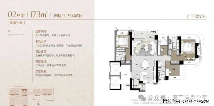 173m²的4房2厅3卫+家政间,设计的是竖厅类双龙抱珠格局,独立电梯厅入户约8.13㎡,客厅5.55米开间,LDKB一体化设计,主卧套房270°环幕凸窗+私享阳台,八大凸窗+设备平台+家政间,分别做到了主卧27.1㎡/次卧14.87㎡/次卧12.38㎡/次卧8.38㎡/家政间2.93㎡+阳台1.38㎡(实测面积,去掉墙体),U型厨房,公卫三段式干湿分离,得房率超90%(包含赠送),阳台9.56㎡正北朝向,看会展中心+市民广场。