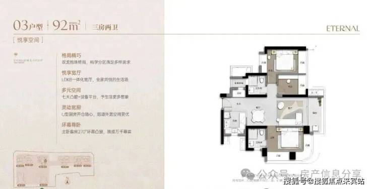 92m²的3房2厅2卫,设计的是双龙抱珠格局,客厅3.2米开间,LDKB一体化宽厅,主卧套房270°环幕凸窗,七大凸窗+设备平台,分别做到了主卧16.06㎡/次卧12.82㎡/次卧6㎡(实测面积,去掉墙体),U型厨房,卫生间干湿分离,得房率超90%(包含赠送),阳台实测6.54㎡正东朝向。