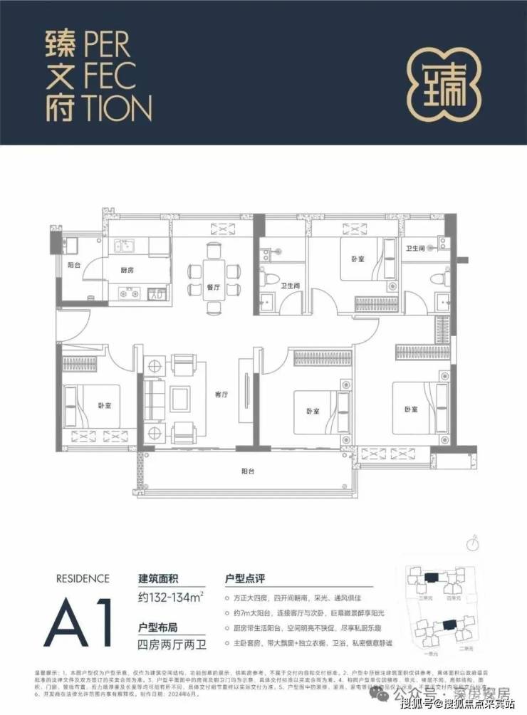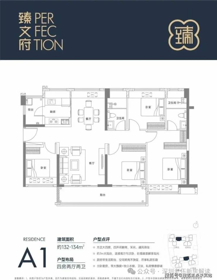 132㎡的4房2厅2卫,设计的是竖厅南北通透格局,一体化客餐厅,四开间朝南,全屋飘窗,客厅连接次卧出7米长的大阳台,主卧大套房设计,二字型厨房还带1个小生活阳台,卫生间干湿分离,阳台主朝东南向。